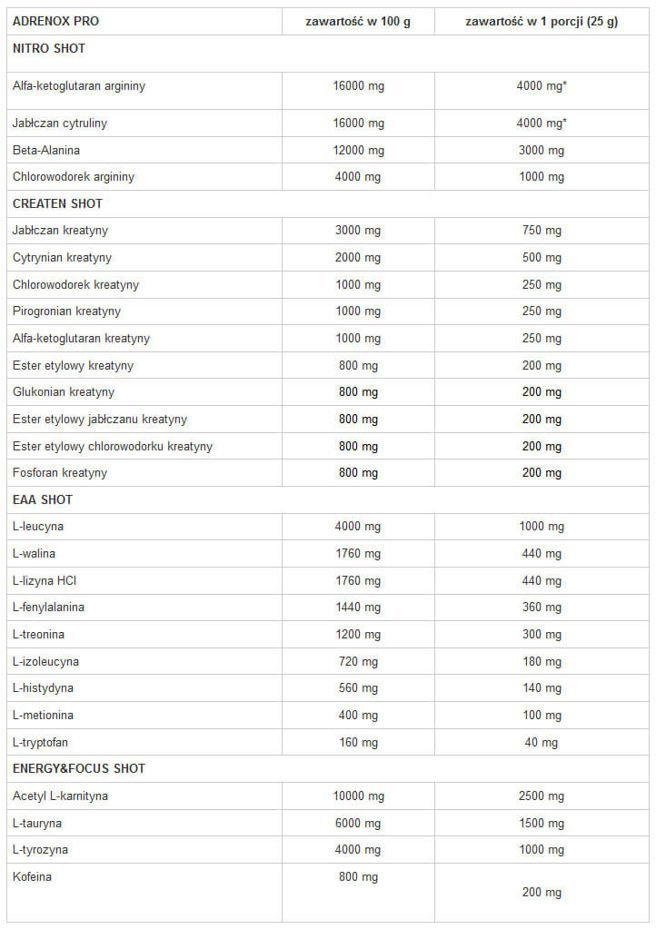 ADRENOX PRO zawartość w 100 g zawartość w 1 porcji (25 g)