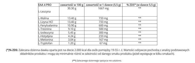 (*)% ZDS: Zalecana dzienna dawka oparta jest na diecie 2.000 kcal dla osób pomiędzy 19-55 r. ż. Wartości odżywcze pochodzą z analizy podstawowych składników produktu i mogą się minimalnie różnić w zależności od danego smaku produktu (jeżeli występuje w kilku smakach).
