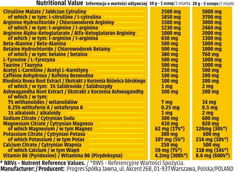 Ingredients: Citrulline Malate, Arginine Hydrochloride, Arginine Alpha-Ketoglutarate, Beta-Alanine, Betaine Hydrochloride, L-Tyrosine, Acetyl L-Carnitine, Magnesium Citrate, Calcium Citrate, Potassium Citrate, Sodium Citrate, Caffeine Anhydrous, Rhodiola Root Extract (Rhodiola Rosea), Ashwagandha Root Extract (Withania Somnifera), Pyridoxine Hydrochloride (Vitamin B6), Acidity Regulator: Citric Acid, Anti-Caking Agent: Silicon Dioxide, Magnesium Stearate; Flavours (depending on the flavour), Colourants (depending on the flavour / colour of the product): Cocoa Brown, Chlorophyll, Beta-Carotene, Beetroot Red, Sweetener: Sucralose, Steviol Clycosides.