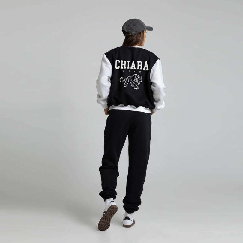 A two-colour baseball jacket by the Polish brand Chiara Wear with CH embroidery on the front and a large Chiara Wear embroidery with a tiger on the back.