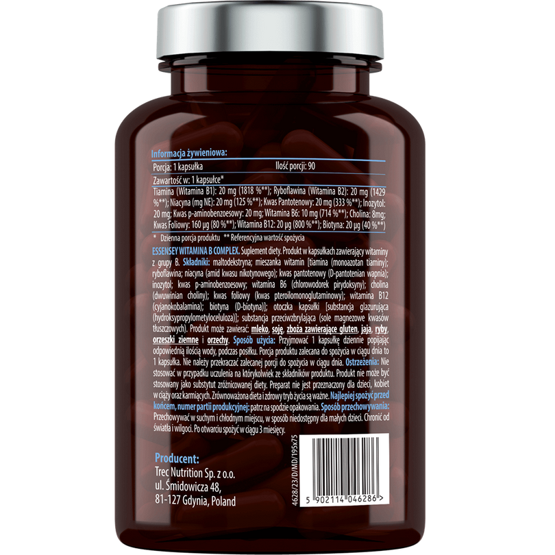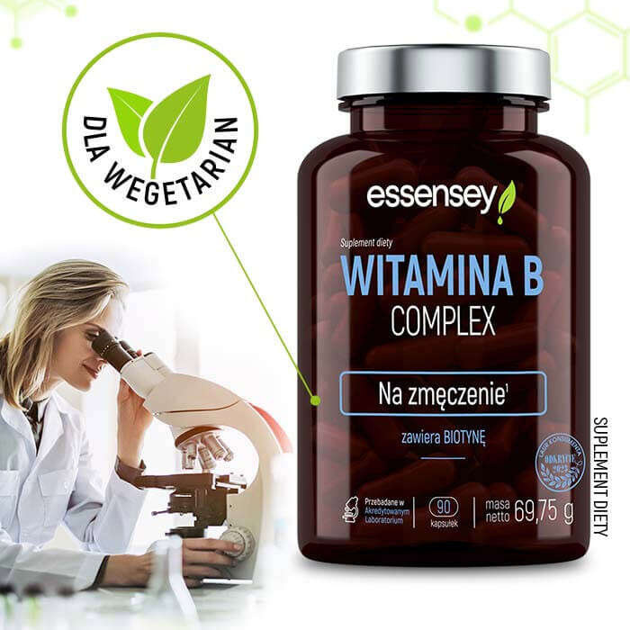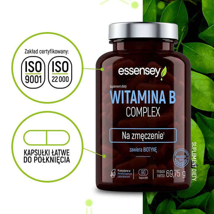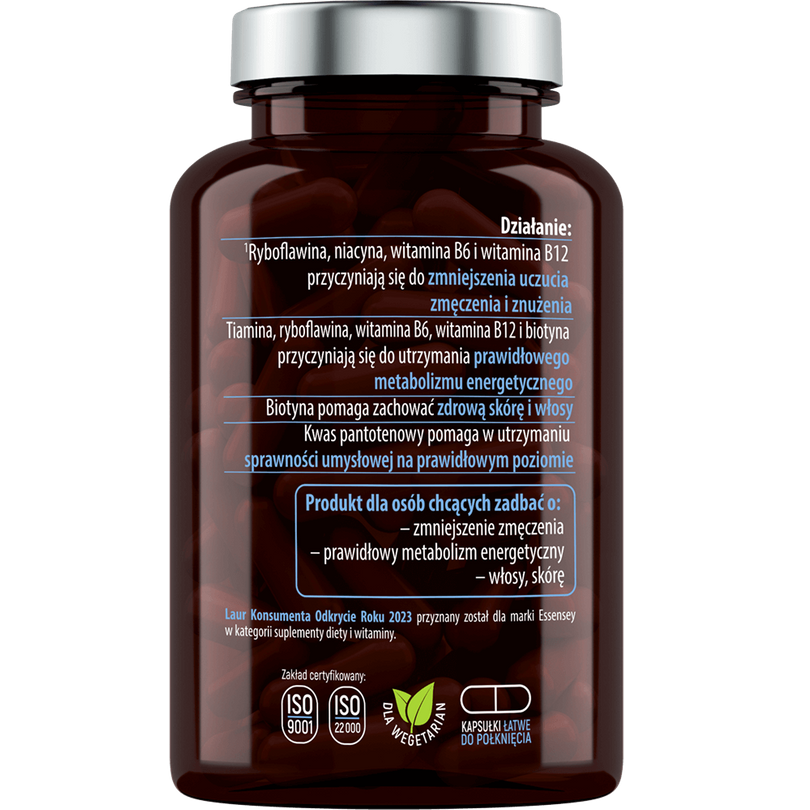 ESSENSEY VITAMIN B COMPLEX dietary supplement contains, among others: vitamins B6 and B12, which contribute to reducing the feeling of tiredness and fatigue and maintaining proper energy metabolism1.