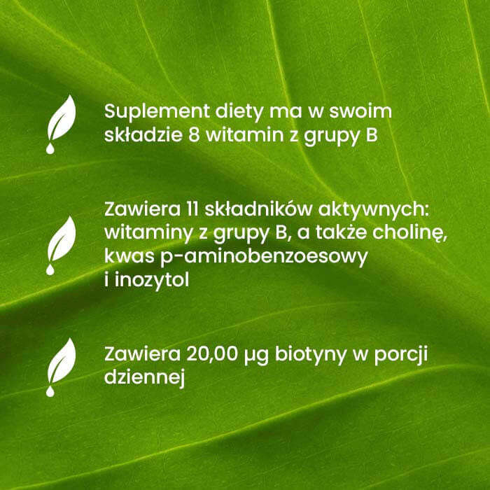 - contains 11 active ingredients: B vitamins, as well as choline, p-aminobenzoic acid and inositol