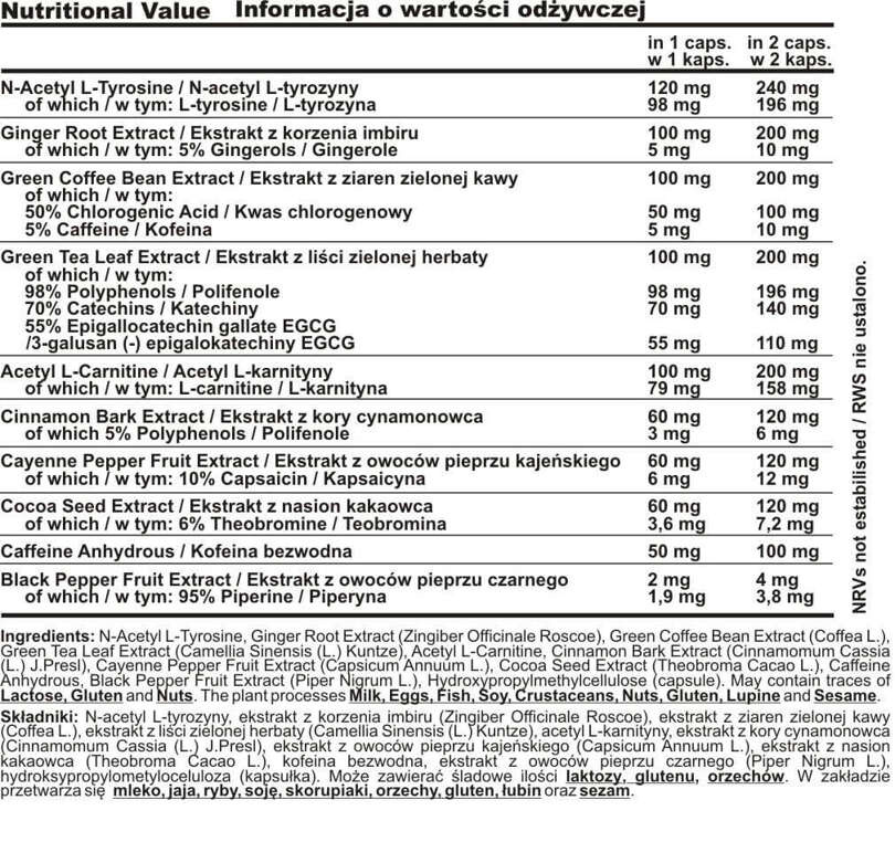 GenLab Thermo Armour II Ingredients: N-Acetyl L-Tyrosine, Ginger Root Extract (Zingiber Officinale Roscoe), Green Coffee Bean Extract (Coffea L.), Green Tea Leaf Extract (Camellia Sinensis (L.) Kuntze), Acetyl L-Carnitine, Cinnamon Bark Extract (Cinnamomum Cassia (L.) J.Presl), Cayenne Pepper Fruit Extract (Capsicum Annuum L.), Cocoa Seed Extract (Theobroma Cacao L.), Caffeine Anhydrous, Black Pepper Fruit Extract (Piper Nigrum L.), Hydroxypropylmethylcellulose (capsule). May contain traces of Lactose, Gluten, and Nuts. The plant processes Milk, Eggs, Fish, Soy, Crustaceans, Nuts, Gluten, Lupine and Sesame.