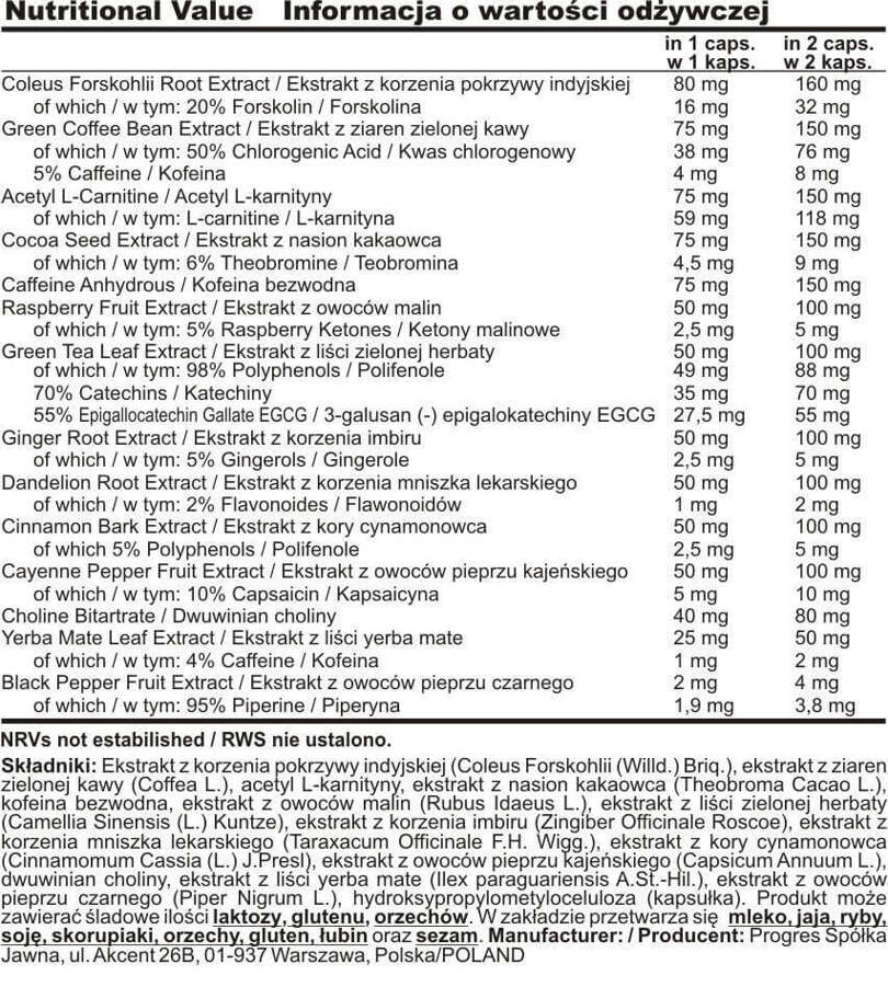 GenLab Fat Assassin Max Ingredients: Coleus Forskohlii Root Extract (Coleus (Willd.) Briq.), Green Coffee Bean Extract (Coffea L.), Acetyl L-carnitine, Cocoa Seed Extract (Theobroma Cacao L.), Caffeine Anhydrous, Raspberry Fruit Extract (Rubus Idaeus L.), Green Tea Leaf Extract (Camellia Sinensis (L.) Kuntze), Ginger Root Extract (Zingiber Officinale Roscoe), Dandelion Root Extract (Taraxacum Officinale F.H. Wigg.), Cinnamon Bark Extract (Cinnamomum Cassia (L.) J.Presl), Cayenne Pepper Fruit Extract (Capsicum Annuum L.), Choline Bitartrate, Yerba Mate Leaf Extract (Ilex paraguariensis A.St.-Hil.), Black Pepper Fruit Extract (Piper Nigrum L.), Hydroxypropylmethylcellulose (capsule). May contain traces of Lactose, Gluten, and Nuts. The plant processes Milk, Eggs, Fish, Soy, Crustaceans, Nuts, Gluten, Lupine and Sesame.