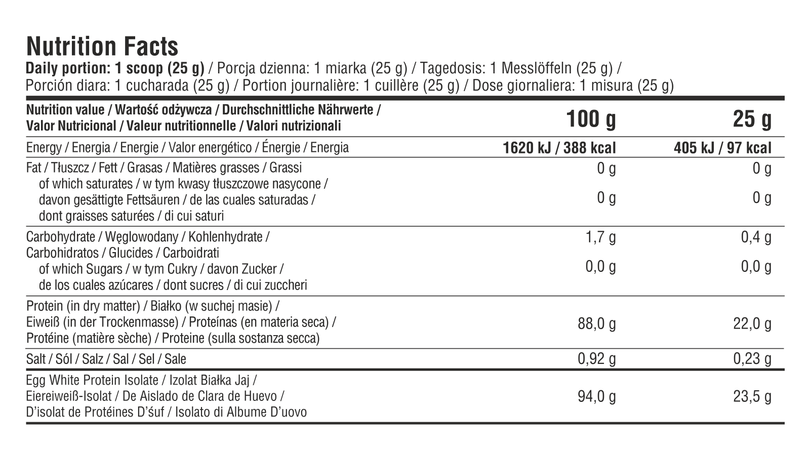 | Egg White Protein Isolate | 94 g | 23,5 g |