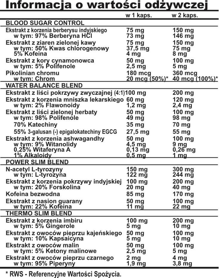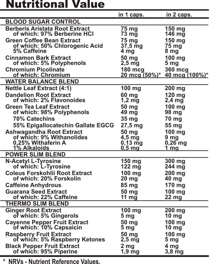 Ingredients: N-acetyl L-tyrosine, common nettle leaf extract (Urtica Dioica L.), Indian nettle root extract (Coleus Forskholii (Willd.) Briq.), ginger root extract (Zingiber Officinale Roscoe), anhydrous caffeine, Indian barberry root extract (Berberis Aristata DC), green coffee bean extract (Coffea L.), dandelion root extract (Taraxacum Officinale F.H. Wigg.), cinnamon bark extract (Cinnamomum Cassia (L.) J.Presl), green tea leaf extract (Camellia Sinensis (L.) Kuntze), ashwagandha root extract (Withania Somnifera (L.) Dunal), guarana seed extract (Paullinia Cupana Kunth), cayenne pepper fruit extract (Capsicum Annuum L.), raspberry fruit extract (Rubus Idaeus L.), black pepper fruit extract (Piper Nigrum L.), chromium picolinate, hydroxypropyl methylcellulose (capsule).