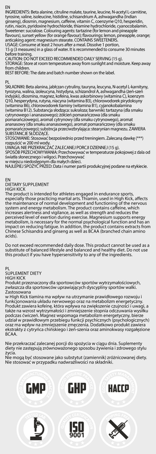 - HIGH KICK is a pre-workout formulation dedicated primarily for athletes going for endurance, dynamics, shape and speed.