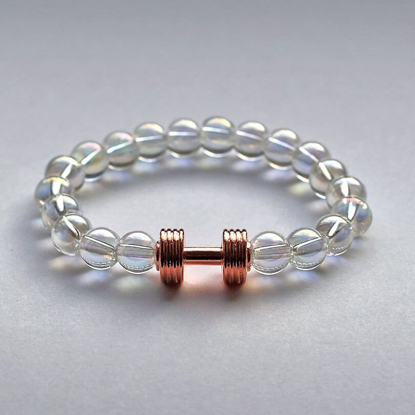 Oryginalna bransoletka na silikonowej gumce ze szklanych, przezroczystych koralików z tęczowym połyskiem, które mienią się jak bańki mydlane. W bransoletkę wkomponowana jest metalowa sztangielka w pięknym kolorze różowego złota. Idealna dla miłośniczek treningu siłowego - wyraź swoją pasję w niebanalny sposób!