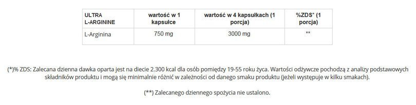 ULTRA L-ARGININE wartość w 1 kapsułce  wartość w 4 kapsułkach (1 porcja) %ZDS* (1 porcja)