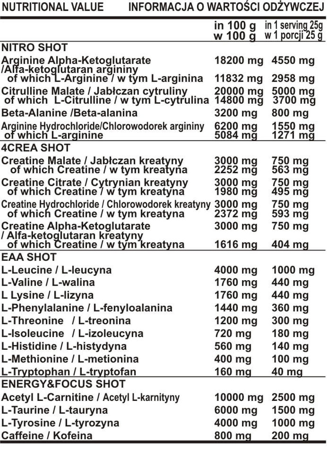 Składniki: Jabłczan cytruliny, alfa-ketoglutaran argininy, acetyl L-karnityny, chlorowodorek argininy, L-tauryna, L-tyrozyna, L-leucyna, beta-alanina, jabłczan kreatyny, cytrynian kreatyny, alfa-ketoglutaran kreatyny, chlorowodorek kreatyny, L-walina, L-lizyna, L-fenyloalanina, L-treonina, kofeina, L-izoleucyna, L-histydyna, L-metionina, L-tryptofan, aromaty - w przypadkuproduktu smakowego, barwnik (w zależności od smaku): beta-karoten, czerwień buraczana, chlorofil, substancja słodząca: glikozydy stewiolowe, erytrytol.