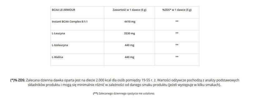 BCAA L8 ARMOUR Zawartość w 1 dawce (5 g) %ZDS* w 1 dawce (5 g)