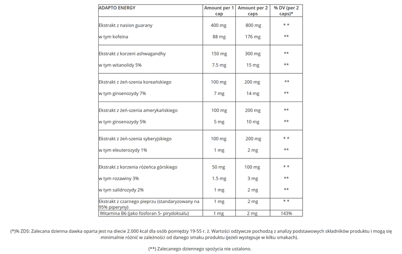 ADAPTO ENERGY | Amount per 1 cap | Amount per 2 caps | % DV (per 2 caps)* |