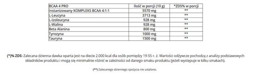 BCAA 4 PRO | Ilość w porcji (10 g) | *ZDS% w porcji |