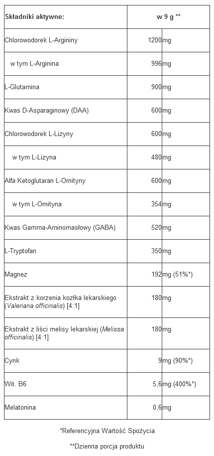 Maltodekstryna; chlorowodorek L-argininy; magnez (sole magnezowe kwasu cytrynowego, mleczan magnezu); L-glutamina; kwas D-asparaginowy (DAA); chlorowodorek L-lizyny; alfa ketogutaran L- ornityny; kwas gamma-aminomasłowy (GABA); L-tryptofan; aromaty; ekstrakt z korzenia kozłka lekarskiego (Valeriana officinalis) [4:1]; ekstrakt z liści melisy lekarskiej (Melissa officinalis) [4:1]; substancja przeciwzbrylająca – dwutlenek krzemu; regulator kwasowości – kwas jabłkowy; substancja zagęszczająca - sól sodowa karboksymetylocelulozy; cynk (glukonian cynku); substancja słodząca – sukraloza; barwnik – beta-karoten; wit. B6 (chlorowodorek pirydoksyny); melatonina.