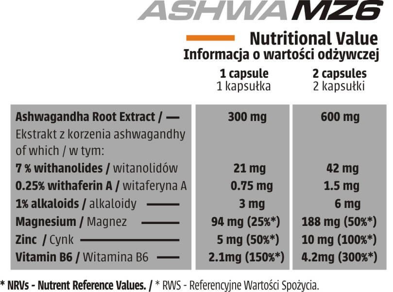 ASHWA MZ6 | Ilość w 1 kapsułce | Ilość w 2 kapsułkach |