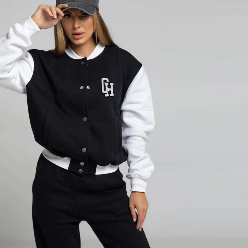 Dwukolorowa kurtka bejsbolówka polskiej marki Chiara Wear z haftem CH z przodu oraz dużym haftem Chiara Wear z tygrysem na plecach.