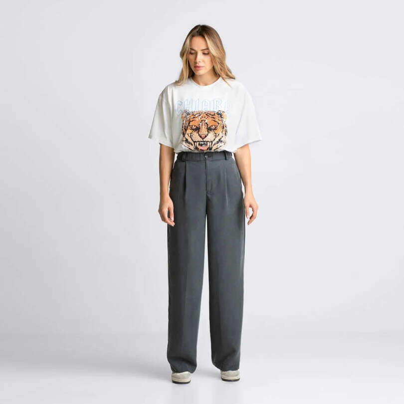 - Biały t-shirt o kroju oversize polskiej marki Chiara Wear z nadrukiem przedstawiającym tygrysa.