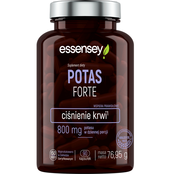 - Essensey Potas Forte zawiera potas, który wspiera prawidłowe funkcjonowanie mięśni i układu nerwowego oraz pomaga w utrzymaniu prawidłowego ciśnienia krwi.