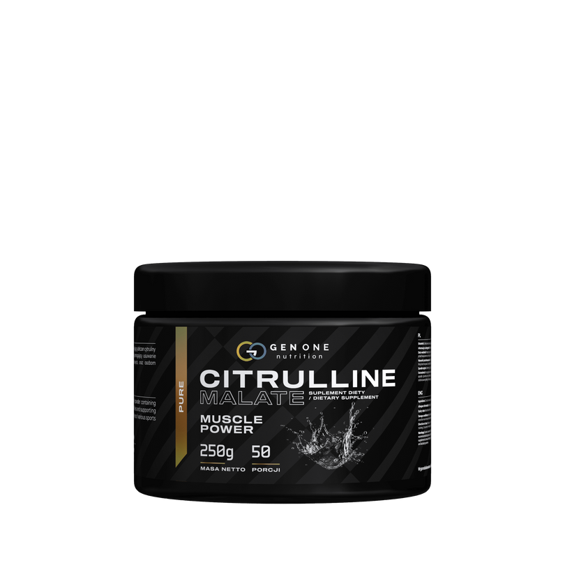 - Gen One Citrulline Malate to cytrulina w formie proszku, która poprawia wydolność, opóźnia zmęczenie i zwiększa pompę mięśniową. Idealna dla sportowców szukających skutecznego wsparcia treningowego bez zbędnych dodatków i marketingowego szumu.