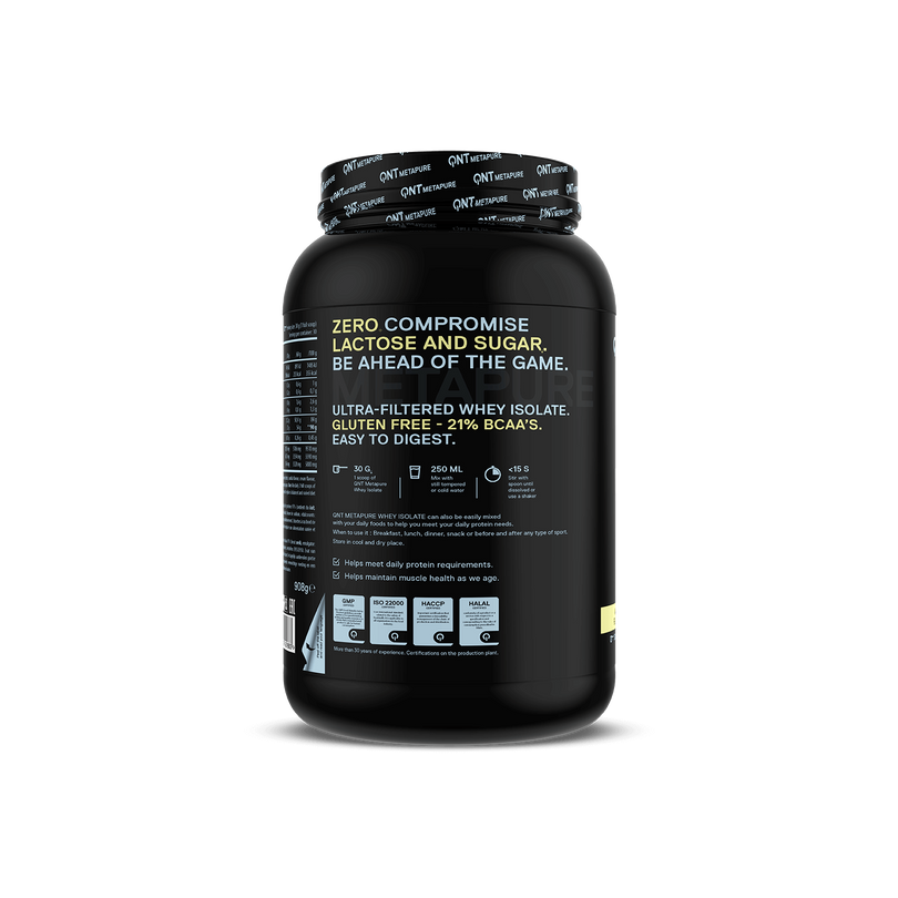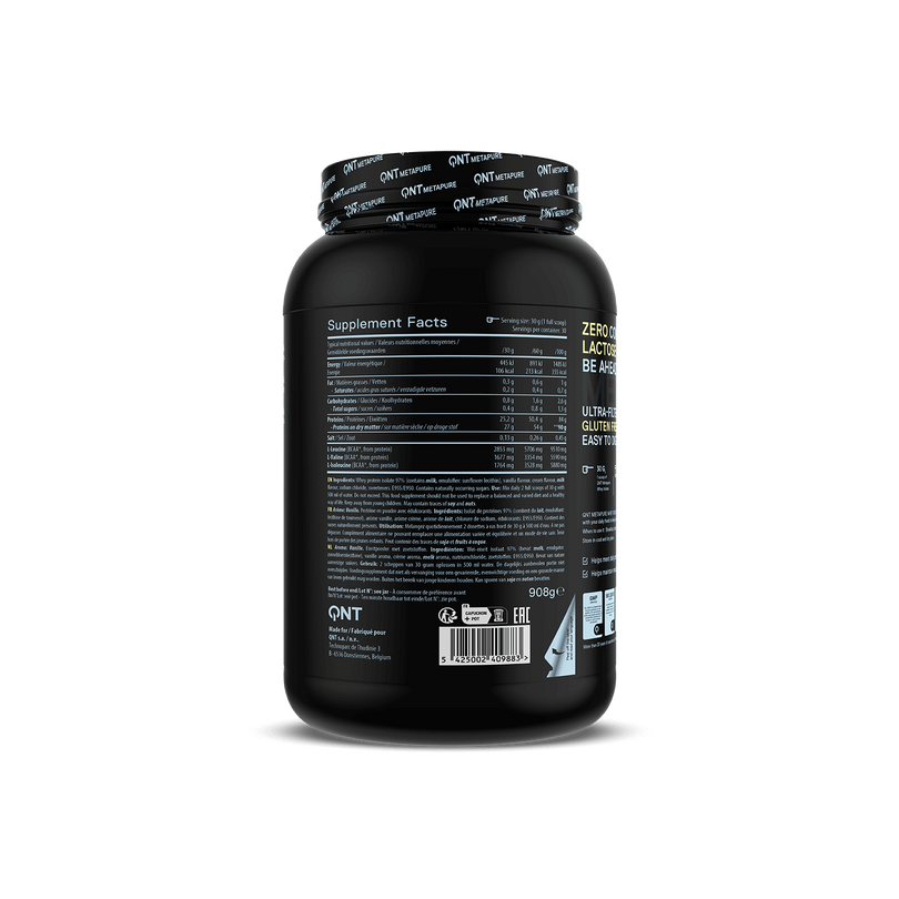 QNT METAPURE ZERO CARB - Najlepszej jakości czysty izolat białka serwatkowego (WPI), o najwyższej wartości biologicznej (bv=159) i bardzo dużej zawartości protein. Składa się z ultra-filtrowanego izolatu białka serwatki, idealnie nadający się dla osób o bardzo wygórowanych wymaganiach smakowych i jakościowych, dbających o sylwetkę i zdrową dietę. Lekkostrawna formuła zawiera także aminokwasy, w tym BCAA. Znakomicie sprawdza się zarówno podczas budowy czystej masy mięśniowej, jak i redukcji zbędnej tkanki tłuszczowej.